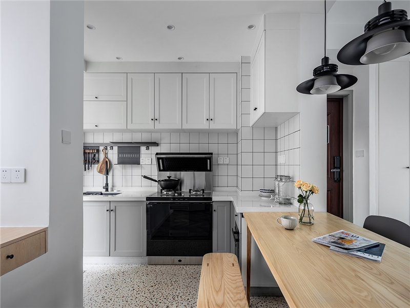 廚房變比較大, 因?yàn)閺N房比較小,所以打通了和餐廳的墻面,與餐廳做成了開放式,這樣從空間上進(jìn)行了相互利用,而且也增加了餐的樂(lè)趣。