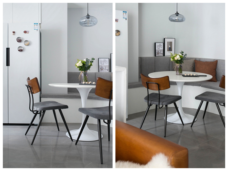 【餐廳裝修設(shè)計(jì)】異形的餐桌搭配上卡座和絨面椅子,質(zhì)感非常不錯(cuò),簡(jiǎn)單大氣。