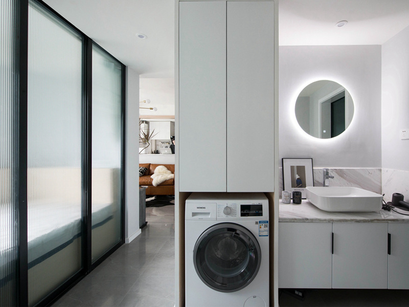 【衛(wèi)生間】洗衣機(jī)鑲嵌在浴室柜旁邊,既方便收納,也節(jié)省了空間。