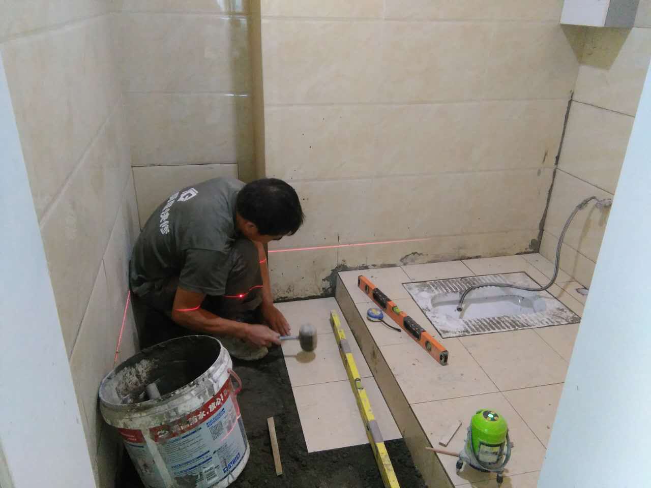 蹲便器的排污口和落水管的預(yù)留口均涂上粘結(jié)劑或者膠泥,將蹲便器的排污口與落水管的預(yù)留口接駁好,校正蹲便器位置。砌磚固定蹲便器,要預(yù)留填碎石的缺口。